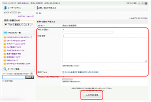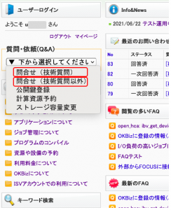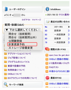 | 問合せ(技術質問) | FOCUSスパコンの技術に関する質問を行う際に利用する。 | 『2.1.新規お問合せ』 |