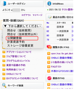 (1) 「質問・依頼(Q&A)」プルダウンリストから依頼内容「公開鍵登録」を選択します。