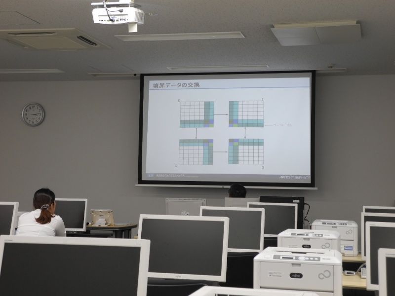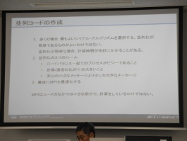 講習会では、HPCIで利用できるスパコンの概要、プロセス並列のみのフラットモデルとプロセス並列とスレッド並列のハイブリッドモデル、大規模並列環境である京コンピュータにおけるハイブリッドモデルの重要性とチューニングのノウハウなどについて解説を行いました。受講者が少なかったこともあり講義の合間にも質疑応答がなされました。