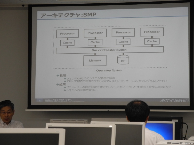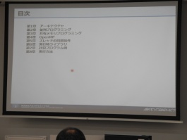 講習会では、HPCIで利用できるスパコンの概要、プロセス並列のみのフラットモデルとプロセス並列とスレッド並列のハイブリッドモデル、大規模並列環境である京コンピュータにおけるハイブリッドモデルの重要性とチューニングのノウハウなどについて解説を行いました。受講者が少なかったこともあり講義の合間にも質疑応答がなされました。