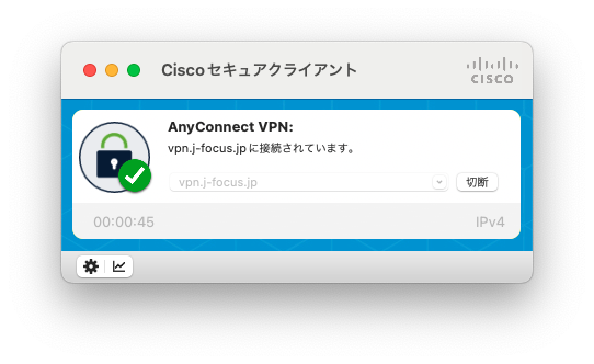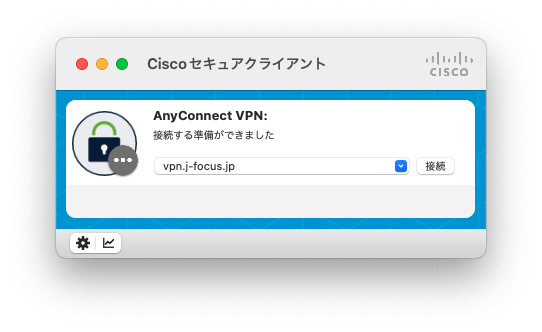接続先に「vpn.j-focus.jp」を入力し「接続」ボタンを押します。
