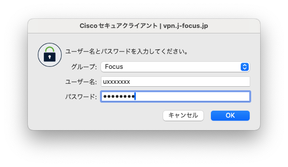 - 下記の画面が出力されたら、Groupを「Focus」、「Username」と「Password」を入力して「OK」ボタンを押します。