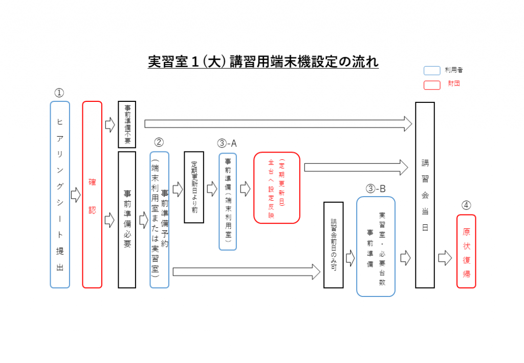 開催日の前日に実習室を予約し必要台数分の講習用端末に設定作業を実施してください。講習用端末@実習室全台に、講習会ソフトの導入やファイルの配置等の事前準備作業を行ってください。
